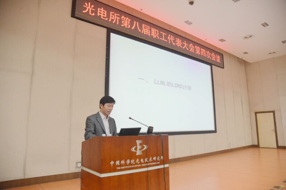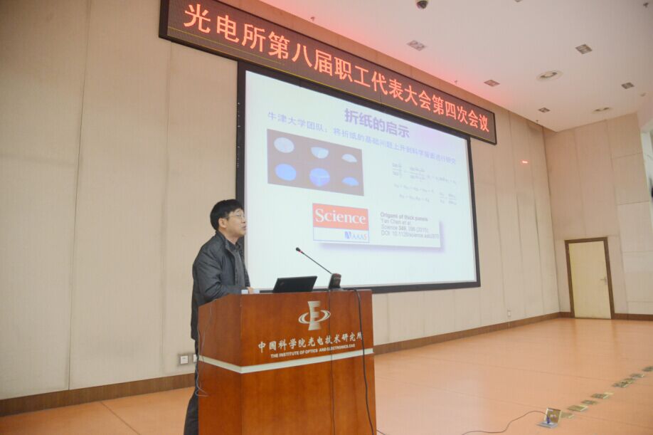 刘恩海作大会总结。他表示,在研究所改革发展问题上要短期规划和长期规划相结合;要重视科研后备力量储存;全所职工要以中央“三严三实”专题教育精神为引导,实实在在谋事做人。他鼓励青年科研人员充分发挥创新活力,为“光电梦”的实现贡献力量。