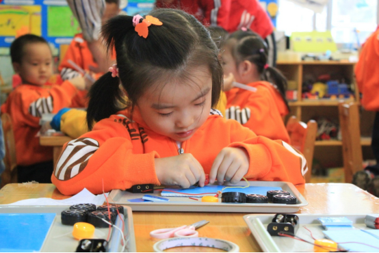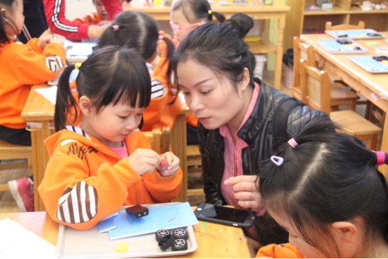 彭燕副教授指导小朋友完成电动快艇的电路组装