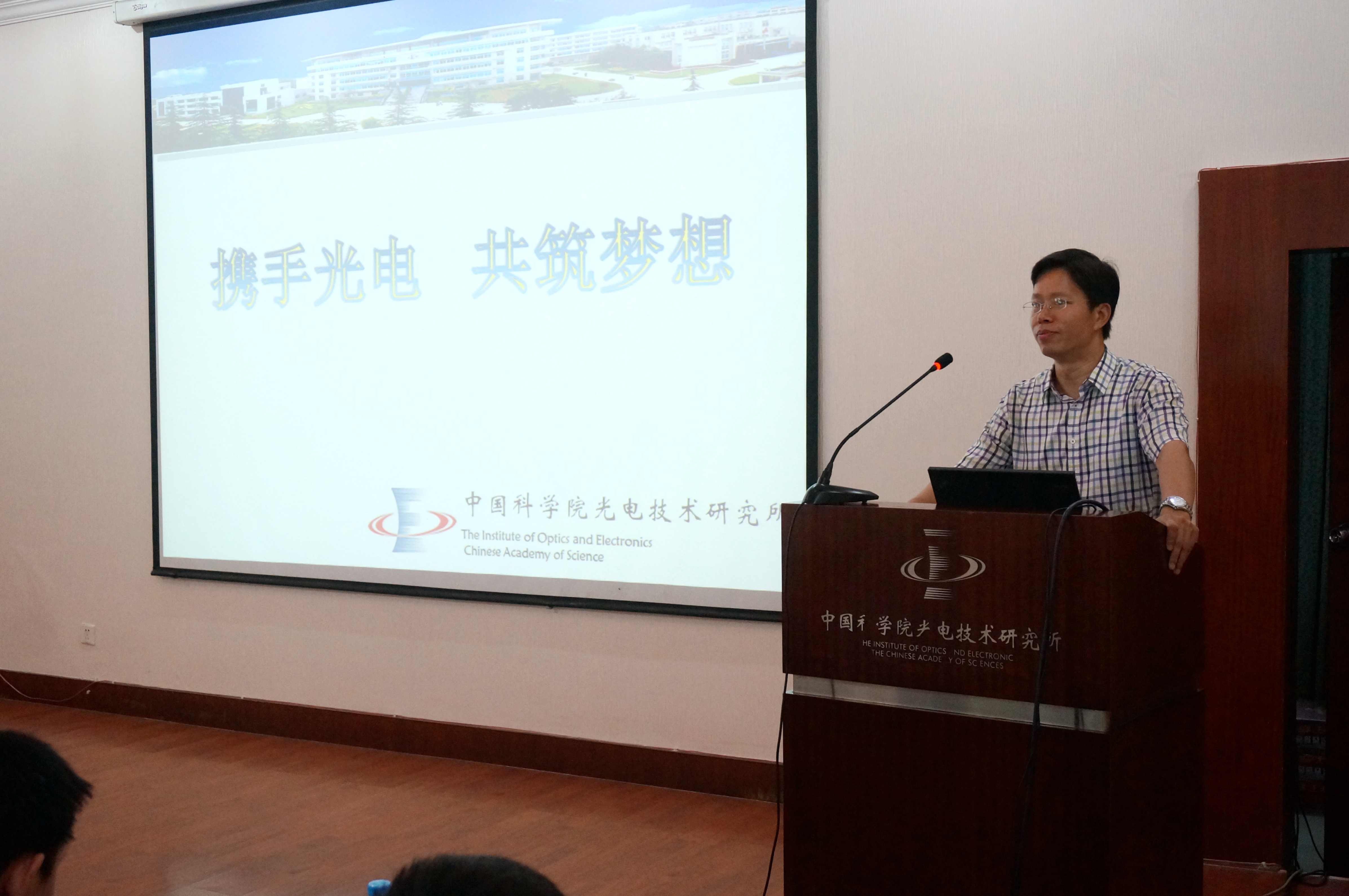 饶长辉在开营仪式上致欢迎辞。他首先对参加夏令营的全体营员表示热烈欢迎,鼓励营员充分利用未来一周的时间,了解光电所的科研环境、研究动态、研究生培养等,为自己今后求学、择业等做好铺垫。他希望同学们在接下来几天的活动中,有所收获,有所感悟,为自己留下一段美好的回忆。饶长辉还特别作了题为《携手光电 共筑梦想》的专题报告。报告介绍了中国科学院大学的基本情况以及光电所与中国科学院大学的关系,重点介绍了光电所概况、优势学科、科研环境以及研究生教育情况。报告最后,饶长辉表示此次夏令营主题是“梦想光电”,希望广大同学坚定自己的梦想并为之不断努力拼搏。