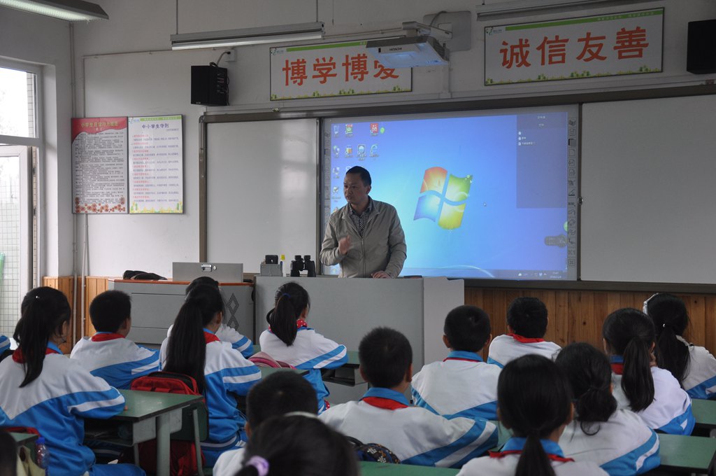 活动中,支部党员分成授课、望远、照明和摄影四个小组分头开展行动。授课组首先来到位于三楼的五年级三班教室,支部书记李萍作了简单的开场白后,支部宣传委员,元件厂副厂长余蓉给同学们介绍道,光电所、元件厂也是从大邑的山沟搬出来的,现在研究所的很多研究成果用于神十、神十一等航天领域。支部同志勉励同学们好好学习,长大投身到祖国的科技建设队伍中去。随后,支部邱正安同志给同学们具体讲解了光的相关知识和应用、望远镜的结构和原理等,同学们听得十分认真,参与性也非常高,尤其当邱正安拿起望远镜实物讲解时,大家都跃跃欲试,并在理论讲解完后,来到操场上进行观测实践。