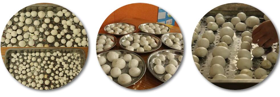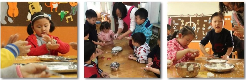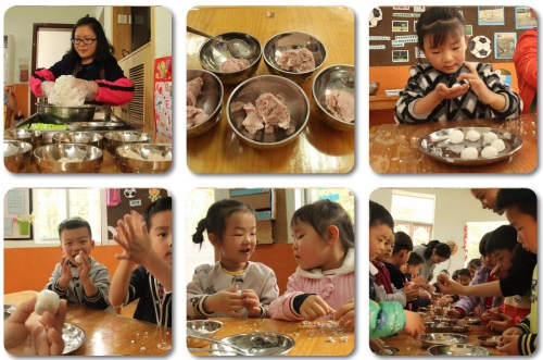 给粉子加上水,把粉和好,孩子们摩拳擦掌,跃跃欲试。搓、捏、按、团,雪白的糯米块,在小手的揉搓中,像变魔术一样,变成形状各异、大小不一的汤圆。