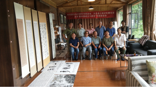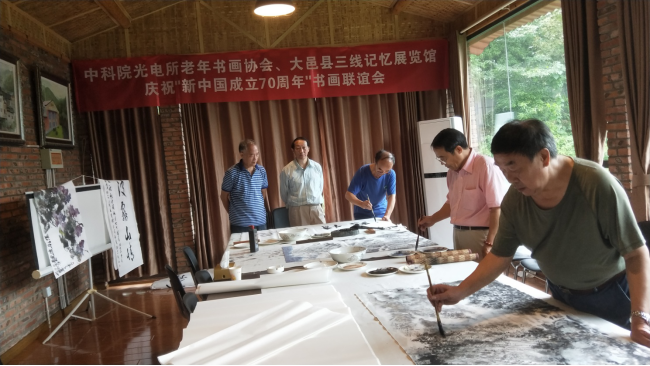 光电所老年书画协会集聚了中国美术家协会会员、中国国画家协会理事刘国华,中国当代硬笔书法家协会会员程绍荣,以及几位四川省、中国科学院书画家协会会员。本次与大邑三线建设记忆展览馆联谊,我所参会老同志创作了“三线情结”、“雾山听涛”等作品,以此庆祝新中国成立70周年。