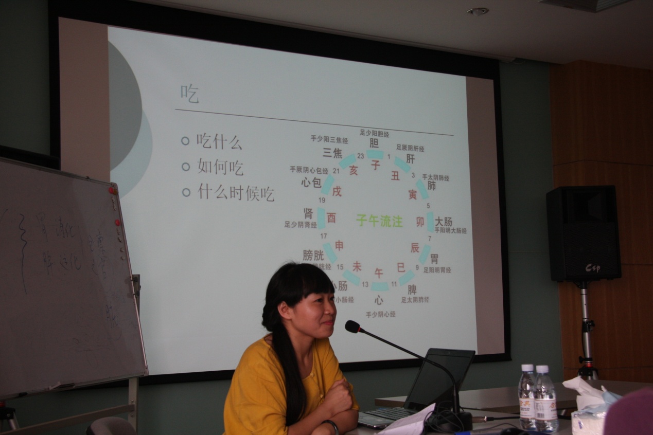 杨露晨的报告主题是“科研人员如何养生”,她带着亲切的笑容,以一问一答方式开始此次轻松而愉悦的医学讲座。杨医生精心准备了PPT和各种临床病例,分别从“吃”、“睡”和“运动”三个最基本的方面给大家讲述和分享她的理念和经验:她以我们传统的中医“治未病”理念,告诉大家“人以天地之气生”,指导大家如何养成健康的生活习惯;并贯穿西方先进心理学思想,引导大家多关注自己的内心,追求“爱、喜悦、和平”的喜乐,学会释放压力,排解忧虑。她说一个人的心平气和,可以形成夫妻关系和睦,可以影响家庭生活和谐幸福,可以传递到工作同事间的和睦相处,可以影响社区社会的文明、和谐、诚信和友善。杨医生把平时有压迫感冷漠的医学问题,轻轻松松地娓娓道来,一个个临床案例也有些妙趣横生的意味,现场不时的欢声笑语。杨医生的精彩报告结束后,同事们踊跃举手提问,她一一详细作答交流。会后还有一些同事向杨医生请教关于自己心理认知和意识形态方面的问题,工作及生活压力问题,小范围的讨论也热闹非凡,大家敞开心扉,畅所欲言,讨论的本身已经释放了堆积已久的各种压力和郁闷,亲密无间的探讨大家都意犹未尽。
