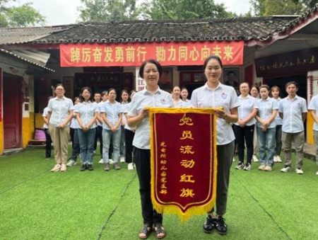在全园教职工的见证下,党员流动红旗传递给获得“双流区优秀班主任”“双流区‘四有’好老师”荣誉称号的王赟同志。王赟同志表示,一定不辜负组织的期望,努力工作,不断进步。