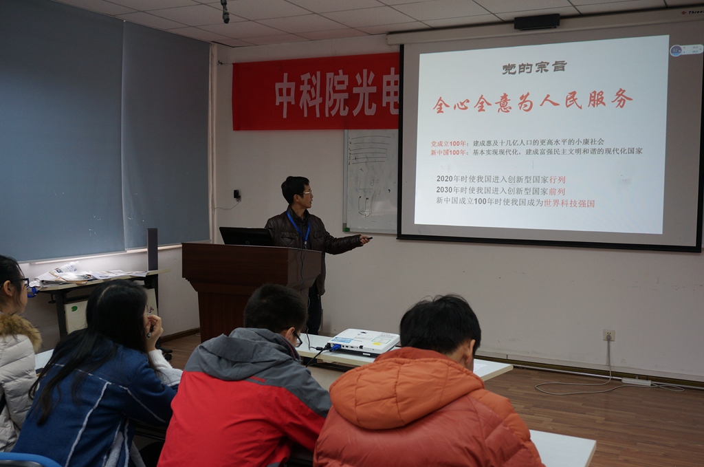 向银辉以习近平主席系列讲话中的科技创新论述为开端,以光电所姜文汉院士主动适应国家需求 “三次转行”为切入点,重点讲述了姜院士带领团队开拓自适应光学方向,为国家科技事业的发展不断做出创新贡献的事迹,为全体研究生党员上了一堂通俗易懂,生动活泼的党课。他勉励研究生党员以姜院
