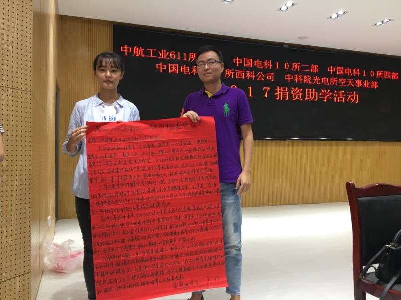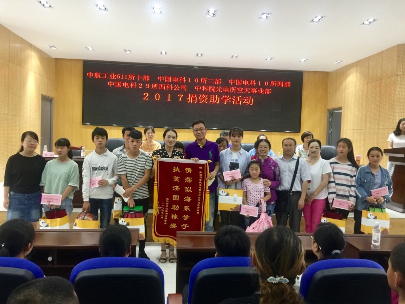 在空天支部精心策划下,支部书记赵汝进同志带领支部党员、职工代表一行为老区学子送去温暖,献上爱心,为名山区万古乡11名贫困学生送去助学金以及捐资购买的书籍、文具、体育用品等。光电所资助学生卢玲在2017年高考中喜获得总分632分优异成绩,并以英语149分高中单科省状元,同时其他受资助同学也在学习、成长方面取得进步,支部对学子们表示祝贺,并鼓励学子努力学习,再创佳绩。名山区政府、妇联对光电所、611所等单位对贫困学生的长期以来的帮助表示感谢。