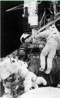 美国宇航员马克·李(左)和斯帝文·史密斯在更换“哈勃”望远镜上的设备
