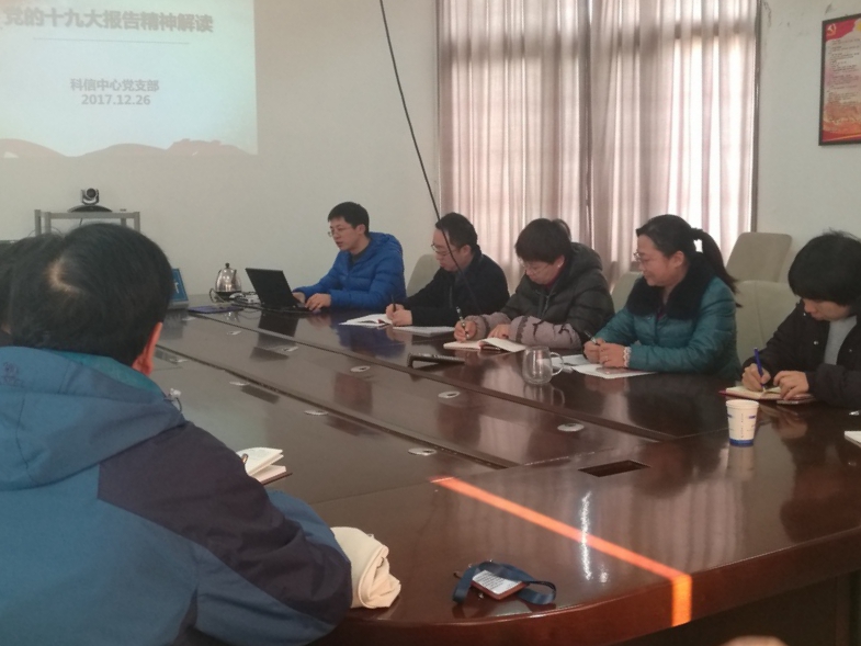 2017年10月18日,中国共产党第十九次全国代表大会在北京隆重召开,习近平总书记代表第十八届中央委员会向大会作了题为《决胜全面建成小康社会夺取新时代中国特色社会主义伟大胜利》的报告。为了让全体党员更好地学习十九大报告,理解十九大的精神,12月26日下午,科信中心党支部开展了学习十九大精神专题党课。此次党课由科信中心主任、支部书记唐勇同志主讲,中心全体党员(除一人休假外)参与本次党课学习。