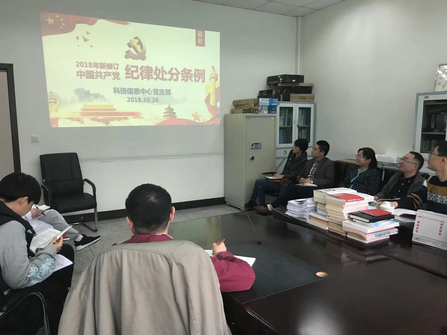 2018年8月18日,中共中央印发了修订后的《中国共产党纪律处分条例》。为进一步提高党员遵规守纪意识,加强组织队伍建设,10月26日上午,光电所科信中心党支部围绕新修订的《中国共产党纪律处分条例》开展了专题党课学习,科信中心全体党员参加。