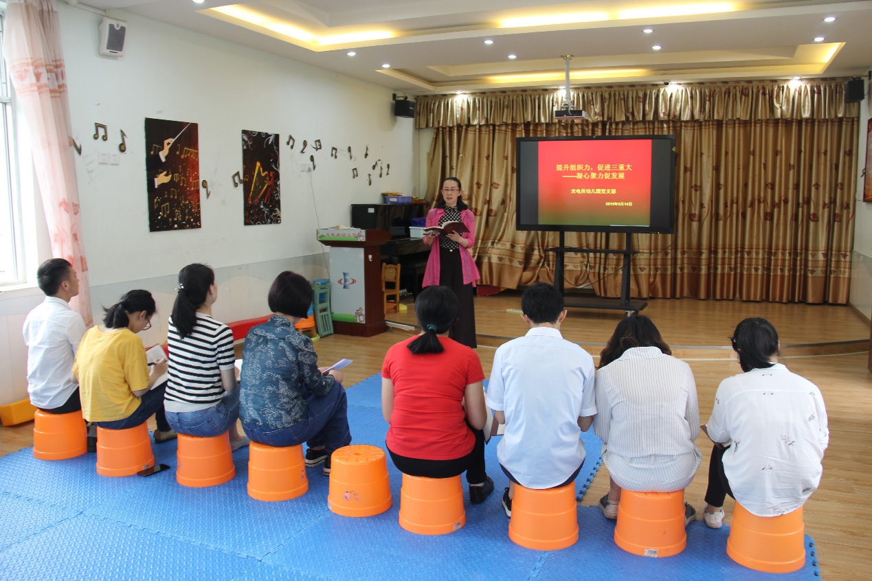 2019年5月14日,光电所幼儿园党支部全体成员齐聚多功能厅,开展以“提升组织力,促进‘三重大’------凝心聚力促发展”为主题的党支部活动。本次会议由党支部书记蒲庆霞主持。