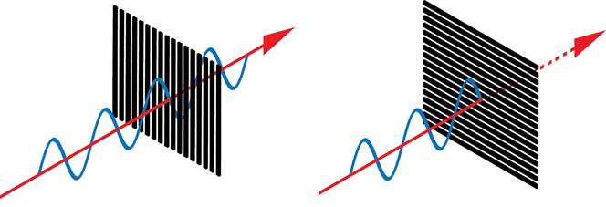 横波的偏振方向可以通过“检偏器”检测出来,例如对于绳波来说,我们可以制作下图所示的“狭缝”来检测偏振方向。当“检偏器”方向(即狭缝方向)与绳波偏振方向一致时,绳波可以很顺利的通过;但“检偏器”方向与绳波方向相互垂直时,绳波无法通过。光学上也有类似的“检偏器”,叫做“偏振镜”,可以让特定偏振方向的光波通过,只是原理会复杂一些,但效果上与检测绳波振动方向的狭缝是一样的。