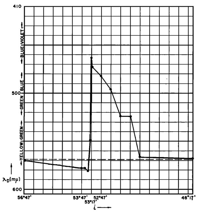 更有意思的是,由于海水存在一定的色散(折射率在不同波长有差异),即便是在占主导的偏振方向上,不同波长光的反射率也会存在一定差异,反射率最高的那个波长会成为“主波长”(Dominant Wavelength)。随着入射光角度i的变化,主波长也会发生偏移。上世纪六十年代,就有学者以地中海为例,研究了20℃情况下反射光主波长随着入射角变化曲线[注释2]。