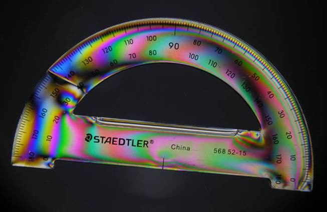 再比如很多透明材料——如玻璃、塑料等——在冷却成型过程中会产生应力,一些特定位置则会出现较强的应力积累,这也将会是材料最脆弱的地方。但由于材料本身是透明的,所以难以直接观察。而应力会改变材料的偏振特性,因此通过偏振成像能够方便地观察器件的应力分布,如下图中彩色条纹变化越剧烈的位置,代表应力积累越严重。