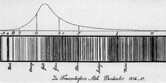 在牛顿之后,英国化学家兼物理学家威廉·海德·沃拉斯顿(William Hyde Wollaston)在1802年研究各种透明物体的折射特性时,发现经过色散后的太阳光谱中存在一些暗线(没有颜色),他当时以为这是不同颜色的分界线,并没有进一步研究,错过了开启一个新学科的机会。十五年后,约瑟夫·冯·夫琅禾费(Joseph von Fraunhofer)基于衍射光栅发明了光谱仪,并独立地再次发现了太阳光谱中的暗线,他发现有574条这样的暗线,这就排除了沃拉斯顿关于颜色分界线猜想。然而当时夫琅禾费的兴趣也不在太阳光谱,并没有关心这些现象背后的理论,他基于光栅光谱仪精确测量了每条暗线对应的波长,只是使用它们来标校玻璃的折射率(他是当时世界上最好的玻璃制造商)。待后人搞清楚这些暗线的由来后,为了纪念这位“使我们更加接近星星”的人(夫琅禾费的墓志铭“He brought us closer to the stars”),这些太阳光谱上的暗线被称为“夫琅禾费线”。