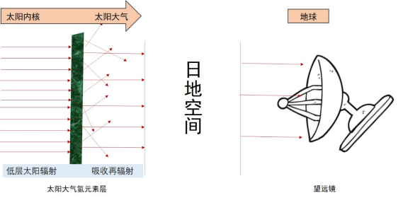 前面我们介绍过,连续谱的太阳光在由内向外辐射的过程中,穿过太阳大气时会被某些元素吸收形成夫琅禾费吸收谱线。于是科学家就想,如果可以研制出透射波长的带宽非常窄的滤光器,只针对这条谱线进行成像,是不是就可以拍摄出对应元素所在位置的太阳表面图像了呢?答案是肯定的。但是理解起来似乎有点困难,你不是说太阳大气中的元素把对应波长的光谱都吸收了吗?怎么还会有图像呢?为什么这个谱线的图像就是元素所在位置的图像呢?为了解释这个问题,我们来看下图,图中我们以氢元素层的吸收为例来说明问题。虽然太阳辐射是呈360°的发散状辐射,但是考虑到地球和太阳的距离,地球上只能接收到很小角度过来的太阳光,我们这里假定是只有一个方向的辐射可以到达地球(平行光)。