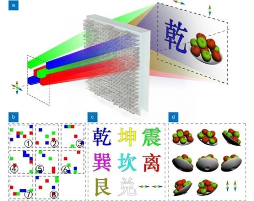 图1 基于码分复用超表面的彩色全息视频显示。(a)原理示意,(b)编码照明信息,(c)和(d)目标重建场景。