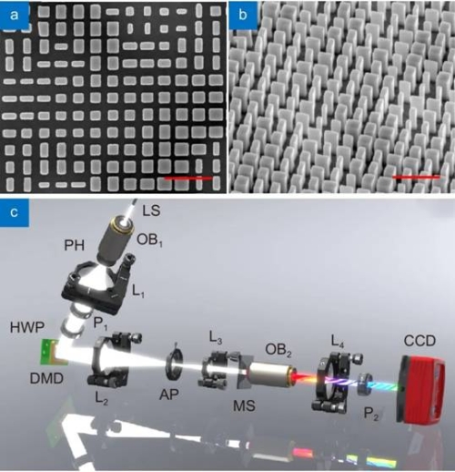 图2 彩色码分复用超表面结构与实验光路。(a)和(b)样品扫描电镜显微成像图,(c)实验光路示意。