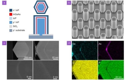 图1 (a) p-i-n InGaAs/InP单量子阱纳米线微LED横向和垂直截面结构示意图;(b)间距为800 nm的纳米线阵列30 倾斜视SEM图;(c)不同放大倍数下纳米线的横截面HAADF-STEM图像;(d) 横截面区域的EDX元素图