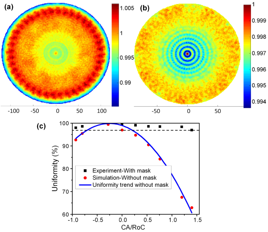 研究人员通过发展计算机辅助方法, 提出了利用理论模拟镀膜过程并设计挡板的方法,快速提高镜片上镀膜厚度的均匀性,研究人员首次找出了厚度均匀性修正挡板的形状和无挡板时薄膜厚度的分布存在的关联规律,通过该联系可以基本确定挡板形状,并将挡板尺寸和单个参数相关联,最后通过简单的局域优化算法可以设计出最终的薄膜厚度均匀性修正挡板形状。利用该方法,研究人员通过单次实验即可将直径400mm的大口径平面镜片上薄膜厚度均匀性提高至99.6%,同时将各种曲面镜片上的薄膜厚度均匀性显著提高至97%以上。该研究推进了虚拟镀膜技术的发展,对其他光学系统上的薄膜厚度均匀性研究有促进作用。