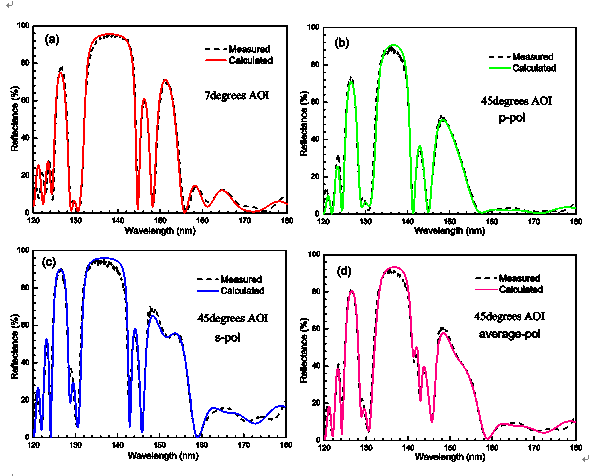 以氧原子发射线光谱成像为例,需要制备出一种R135.6nm/R130.4nm足够高的反射滤光片。国外Zukic等研究人员首先提出采用p结构多层膜设计,优化真空紫外反射滤光片的光谱性能。但是, p结构多层膜设计中存在大量厚度极薄的膜层,增加了真空镀膜的制备难度。此外,光学薄膜材料在真空紫外波段的光学常数正确获取与否,也将显著地影响反射滤光片的最终光谱性能。该课题组研究人员通过光谱反演技术准确获取薄膜光学常数,并限制反射滤光膜膜系中薄层厚度,优化反射滤光膜膜系设计,通过热蒸发真空镀膜工艺制备出理论设计和实测光谱数据一致性良好的真空紫外反射滤光片。实测0°和45°入射角下的反射滤光膜,其R135.6nm/R130.4nm比值分别为92.7和20.6,远优于国外制备的真空紫外反射滤光片。相关成果发表在Appl. Opt. (Appl. Opt. 54(35), 10498-10503, 2015)上。