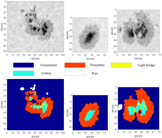 太阳黑子是太阳活动和太阳周期最重要的显示,也是磁场对太阳动力学和结构的影响的重要标志。经过多年的理论研究和实验观测,关于太阳黑子的形成机理和演化过程,仍然有许多问题有待进一步解决。当前太阳物理研究的焦点已经由黑子群这样的大尺度结构,向太阳黑子本影、半影、亮桥等精细化结构转变。通过对精细化结构的大样本统计研究,有助于进一步揭示太阳黑子形成与消亡的过程,以及亮桥的动力学特性。因此,为了对太阳黑子精细结构进行特征提取,对这些精细结构进行自动识别与分割就显得十分必要。