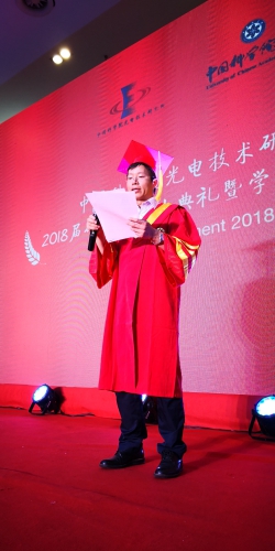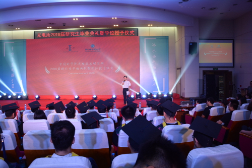 2018年6月8日上午9点,庄重的2018届研究生毕业典礼暨学位授予仪式于在学术报告厅举行。光电所法定代表人、副所长(主持工作)刘恩海,主管科研和研究生教育的副所长饶长辉出席了毕业典礼。毕业生、导师代表、在读研究生代表及部分毕业生亲友参加了典礼。毕业典礼由研究生部向银辉老师主持。