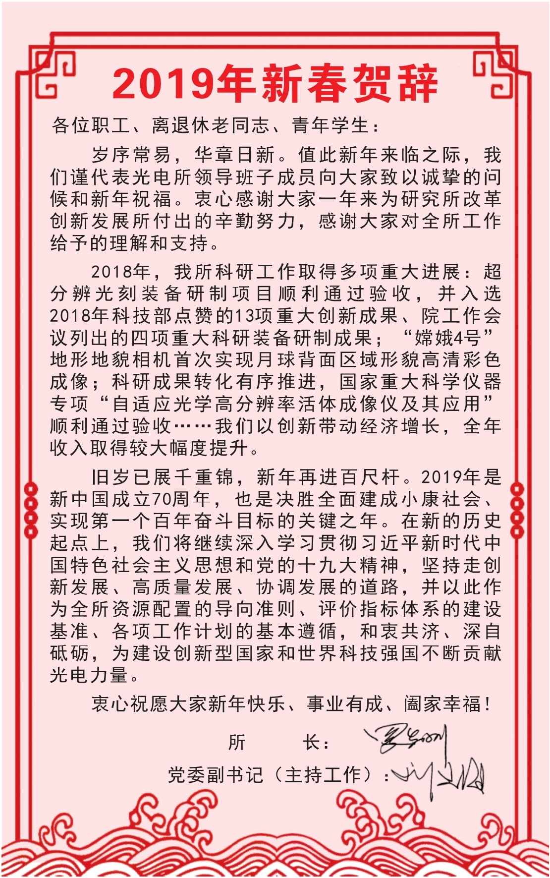 旧岁已展千重锦,新年再进百尺杆。2019年是新中国成立70周年,也是决胜全面建成小康社会、实现第一个百年奋斗目标的关键之年。在新的历史起点上,我们将继续深入学习贯彻习近平新时代中国特色社会主义思想和党的十九大精神,坚持走创新发展、高质量发展、协调发展的道路,并以此作为全所资源配置的导向准则、评价指标体系的建设基准、各项工作计划的基本遵循,和衷共济、深自砥砺,为建设创新型国家和世界科技强国不断贡献光电力量。