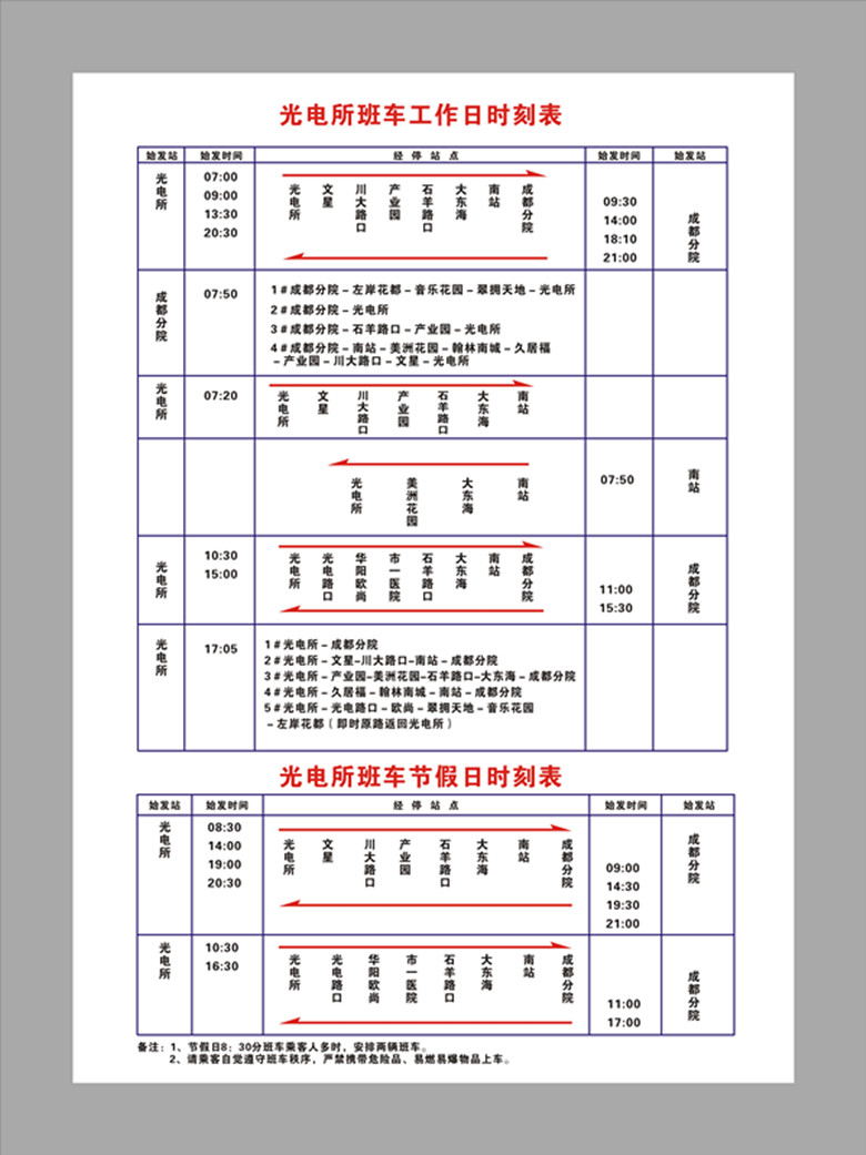 根据光电所第八届职工代表大会第一次会议收集的职工代表提案内容,物业公司本着改进工作、服务职工的宗旨和遵守《成都市非营运交通车辆停靠站点管理规定》的原则,对交通班车行车路线进行了调整。在行车路线、停靠站点和时间间隔安排上既考虑原文星线路人员的乘车需求,也考虑到华阳欧尚购物、市第一人民医院就医等需求以及转乘公交、地铁等社会公共交通的方便。