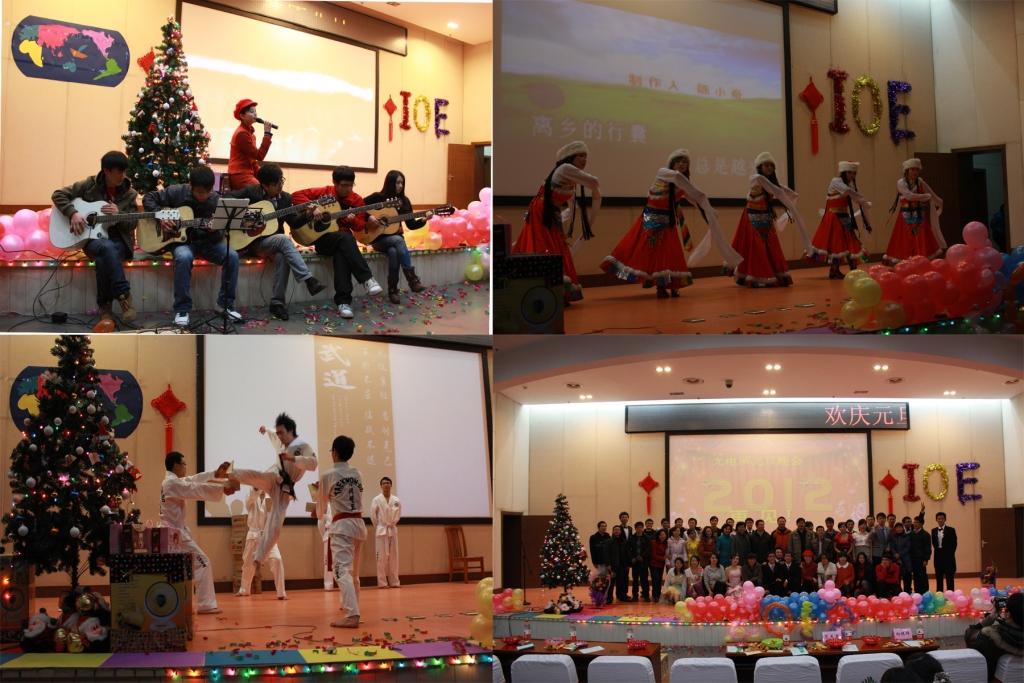 随着《Merry Christmas》这首优美的乐曲被吉他社的成员们弹出,本台晚会正式拉开了序幕。搞笑歌曲《换大米》将观众引领进一个诙谐幽默的世界,街舞《buttons》凭借其动感的节奏调动起观众热涨的情绪,《跆拳道》的精彩表演更是博得了观众的阵阵喝彩,与学生对唱的八室党支部书记向银辉老师用他特有的热情与观众互动,更是感染了在座的每一位观众,也将晚会推向了一个高潮。晚会在优美的旋律《难忘今宵》中圆满落幕。晚会最后,到场嘉宾和晚会所有演员合影留念。
