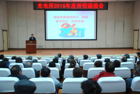 2017年1月12日,光电所在牧马山学术报告厅为离退休职工举行2016年度所情通报会。所情通报会由离退休党总支书记、离退休办负责人曹杰主持,所党委书记杨虎,所党委副书记、副所长、所工会主席魏全忠出席,近80名离退休职工代表参加。