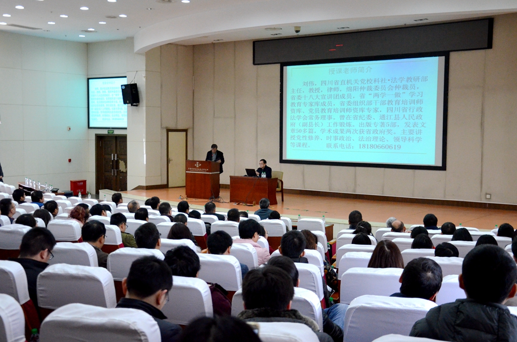 3月2日,光电所举办学习贯彻党的十八届六中全会精神专题辅导报告会。会议邀请四川省直机关党校科社、法学教研部主任刘伟教授作题为《深入推进全面从严治党——学习十八届六中全会精神》的专题辅导报告。党委中心组全体成员、全所中层干部、党务干部、副高及以上人员近200人聆听了此次报告会。会议由党委副书记、纪委书记、副所长魏全忠主持。