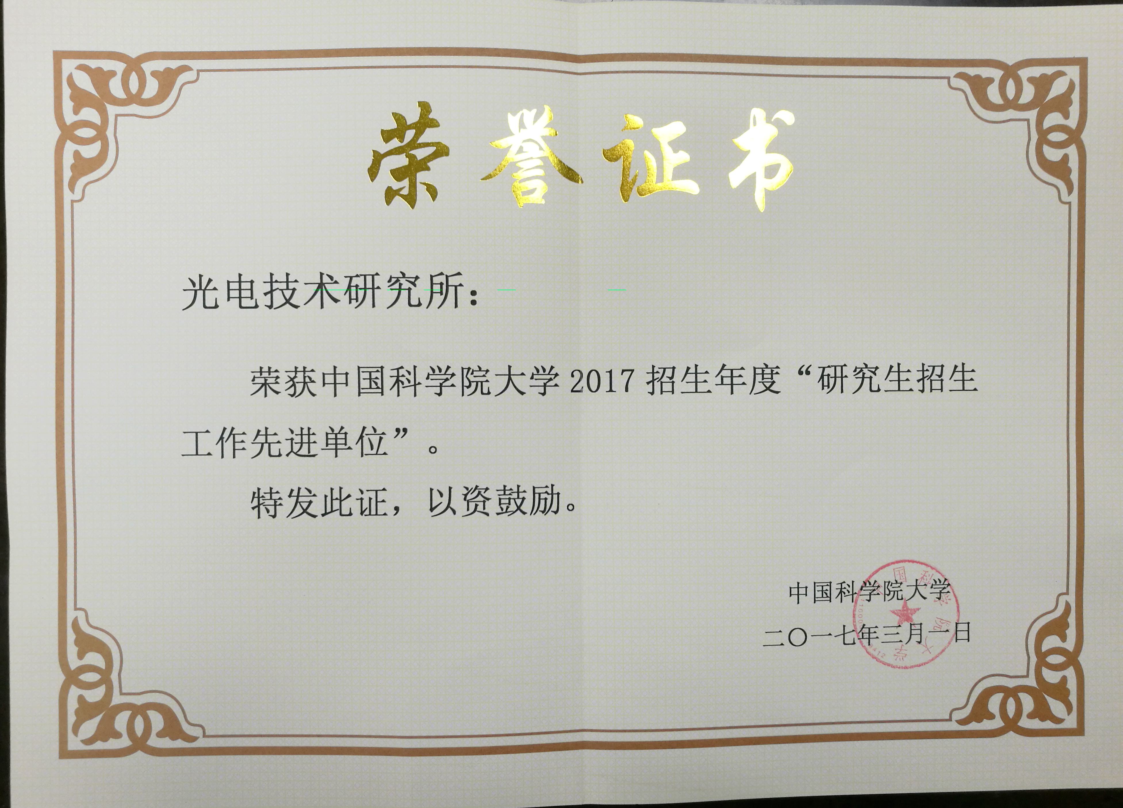 近日,中国科学院大学对2016-2017年度招生工作进行总结和表彰,光电所荣获中国科学院大学 “研究生招生工作先进单位”。