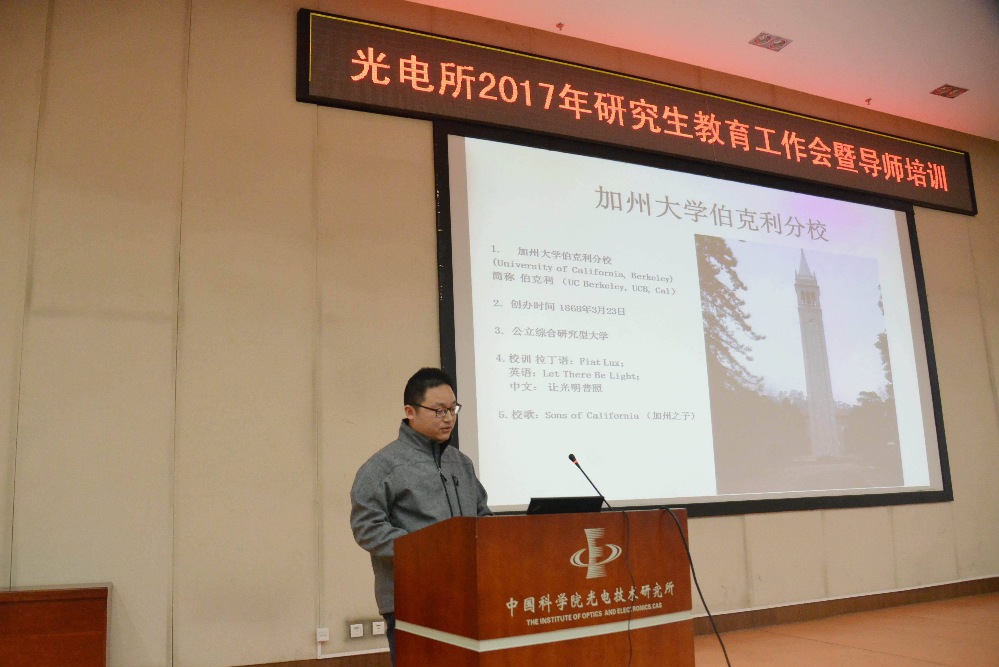 会上,主管研究生教育工作的副所长饶长辉做了题为《光电所研究生教育现状与改革发展思考》的主题报告。首先,他分析了国家“双一流”建设和“创新驱动”发展战略对研究生教育的基本要求。随后,在充分肯定我所研究生教育在推动学科发展、助力科技创新及人才培养等方面成绩的同时,指出了在招生生源、学术型及专业型硕士培养方案、导师考评制度、研究生思想教育和文化建设等方面存在的问题与不足。他借用我国南宋著名哲学家、理学家朱熹“问渠哪得清如许,为有源头活水来 ”名句指出,如果说研究生是推动研究所学科发展、科技创新的一渠“活水”,研究生教育体系则是保持其清流的重要“源头”,必须下决心健全和完善以学科为基础的研究生教育体系,以“科教融合”为抓手创新招生模式,着力实施开题、中期、论文答辩全过程质量控制,在明确导师职责的基础上健全导师考评机制以提高导师自身的学术水平和培养能力。他还强调,要认真学习贯彻习总书记在全国高校思想政治工作会议上重要讲话精神,以立德树人为中心,以全程育人、全方位育人为载体,围绕学生、关照学生、服务学生,为学生点亮理想的灯、照亮前行的路, 激励学生珍惜韶华、脚踏实地,勇做走在时代前列的奋进者、开拓者,用中国梦激扬青春梦。报告最后,他引用前苏联著名教育家苏霍姆林斯基的名言为结语,“世界上没有才能的人是没有的。问题在于教育者要去发现每一位学生的禀赋、兴趣、爱好和特长,为他们的表现和发展提供充分的条件和正确引导”。