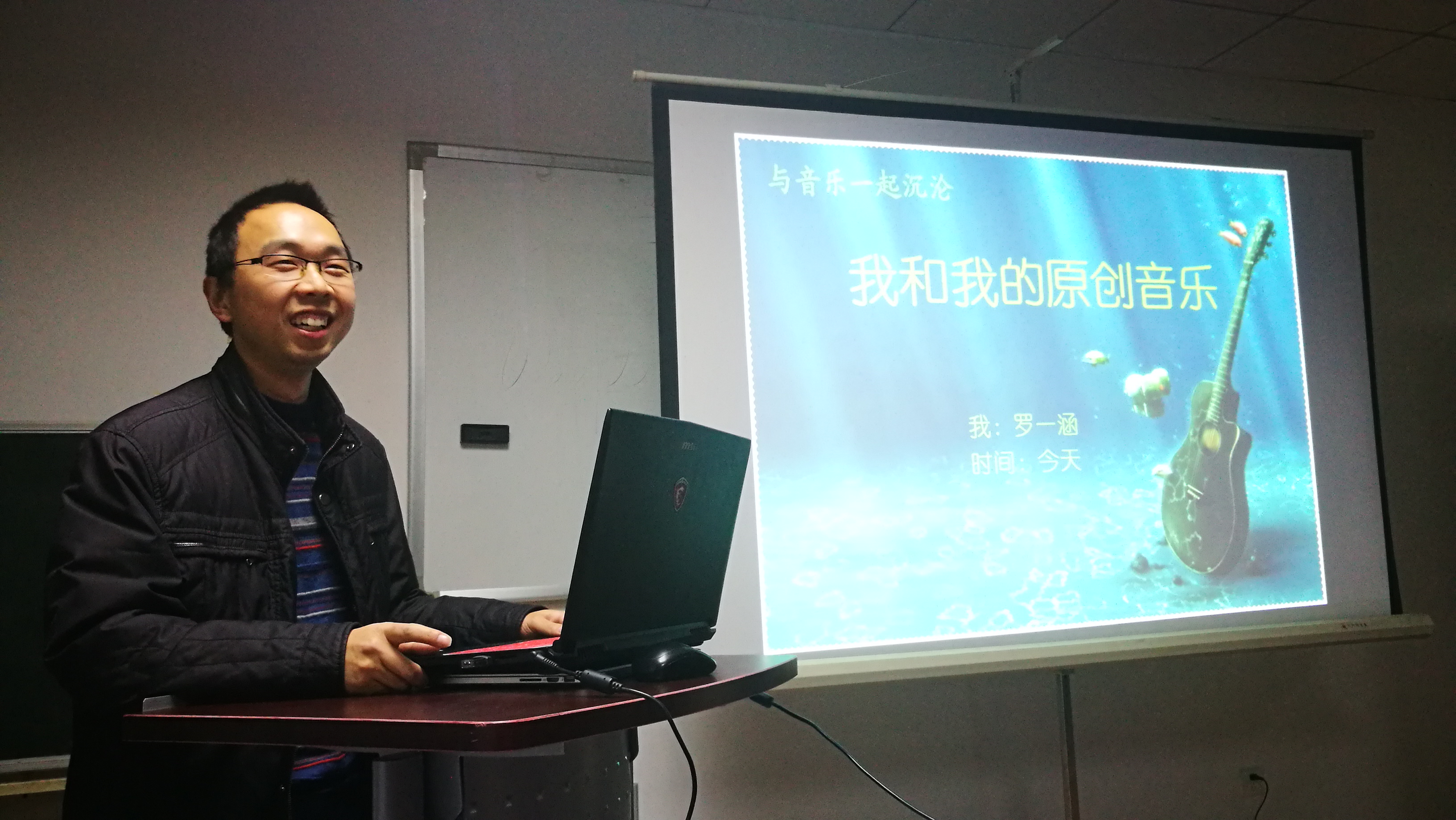 首先炸裂开场的是光电所吉他协会创始人&首届会长2008级罗一涵博士,他在《我和我的原创音乐》中分享了历时十多年原创音乐的艰辛历程和宝贵心得,现场演唱了获得版权的个人原创专辑《风·羽》中13首曲目片段,其中《蓝之舞》得到大家的热烈追捧,使得罗博士不得不在会后留下了该曲的原声。依依不舍之际,罗博士还贴出自己常年打理的原创音乐网www.luoyihan.com,并邀请小伙伴们加入吉他协会,享受音乐的独特魅力。