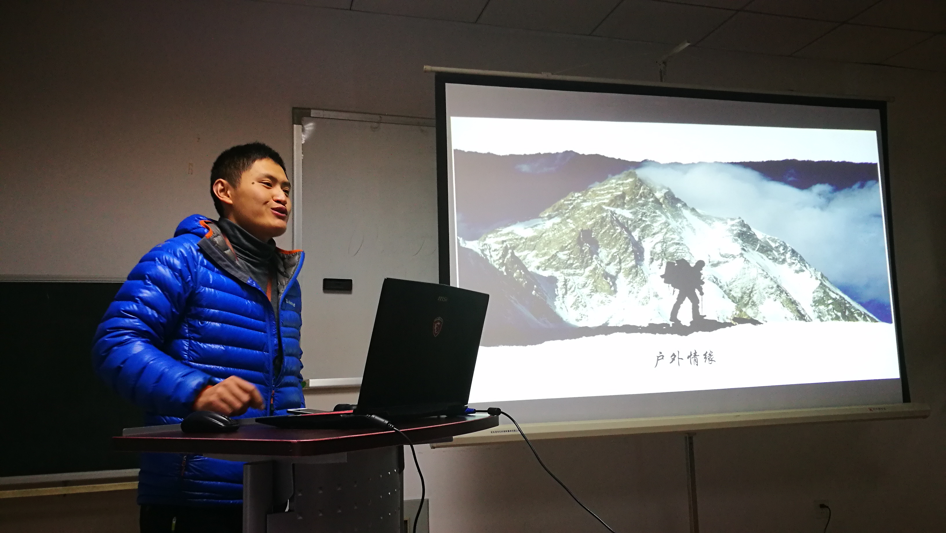 当天最后出场的是体格健壮、曾为重庆大学登山协会创始人的2015级张飞博士,在《户外情缘》中讲述了其艰辛的训练和户外探险经历,展示了在登山、攀岩、攀冰中体验到的顽强、勇敢、智慧、坚韧。雄奇美丽的自然风光和激动人心的户外运动瞬间引爆会场的压轴高潮。