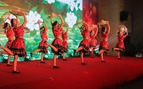 另一个是幼儿园美女老师们的舞蹈“畲山春”,在寒冷冬日里,带来一抹清新、充满生机的绿意与茶韵。