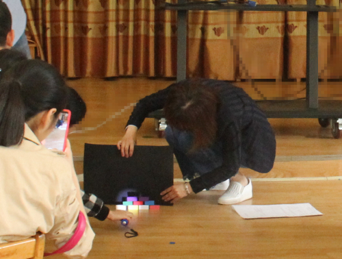 接下来,探索小方块与其他材料的组合玩法。海绵、纸张、塑料板、手电筒、量杯这些和小方块看上去毫无关联的材料,和小方块一起,产生了一个个奇妙的组合——用手电筒发现光与影的关系、小方块包上锡箔纸可以导电、让小方块在纸板和泡沫上玩滑梯了解物体的摩擦力、贴上不同颜色的即时贴学习数的分解与组合、甚至用小方块进行二进制数学运算……直到讨论时间结束,老师们还意犹未尽,集体的智慧,竟然碰撞出28种玩法。