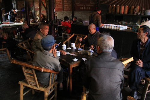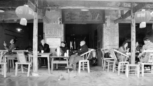 观音阁老茶馆是一家传承了浓郁成都茶馆文化底蕴的百年老茶馆,坐落于双流彭镇一条古老街道的尽头,毗邻青青杨柳河。在这栋砖墙黑瓦的老房子里,厚重的人文印记历历在目, 老茶壶、老茶桌、盖碗茶、艺高人胆大的沏茶艺人,仿佛一下子时光穿越。学子们上午10点到达时,天下着小雨,但茶馆内已经非常热闹,据说每天一大早茶馆就座无虚席,一群白发苍苍的当地老人,每天都会来这里喝茶、打牌、聊天。