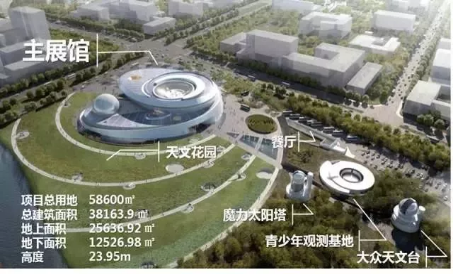 上海天文馆简介:上海天文馆位于上海市浦东新区临港新城,由主展馆、大众天文台(夜天文望远镜)、魔力太阳塔(太阳望远镜)和青少年观测基地等部分组成,总建筑面积约3.8万平方米,预计于2021年建成开放,建成后将成为世界上建筑面积最大的天文馆。其中,魔力太阳塔是上海天文馆白天最重要的天文科普互动设施之一。