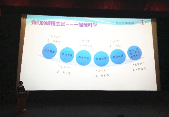 作为唯一一所受邀参加的幼儿园,光电所幼儿园园长杨凌以《STEM理念下的幼儿科学探究活动》为题,分享了光电所幼儿园在“一起玩科学”课程理念下,园本课程发展的四个阶段,并以具体的案例呈现了STEM理念下幼儿园科学探究活动的开展与实施。