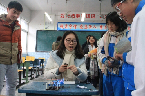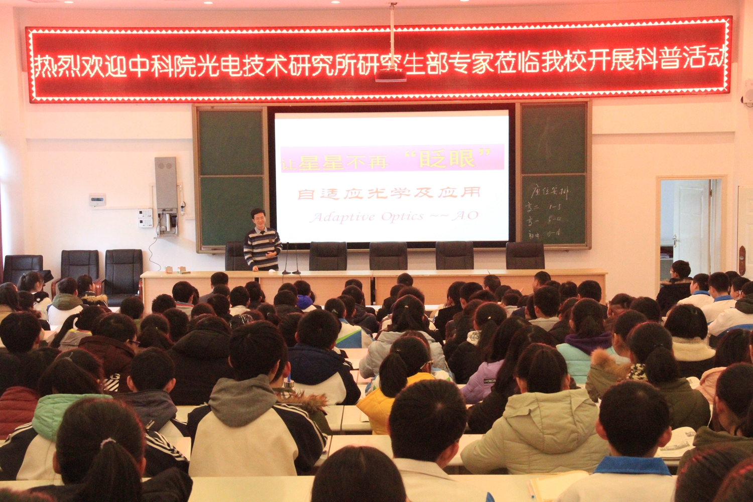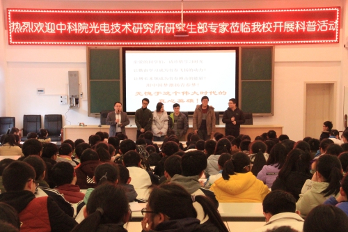 为深入贯彻落实党的十九大精神,提升研究生双创工作和科普实践能力。1月23日,我所19名博士、硕士研究生在研究生部老师带领下,走进遂宁市大英县,就大英县的“双创”工作展开研讨,并为四川省一级示范高中大英中学的150名学子送上了精彩的科普讲座和丰富多彩的光电科技体验活动。