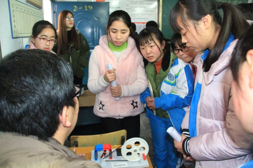 下午两点,向银辉老师为大英中学的学子带来了一堂题为“让星星不再眨眼”的自适应光学科普讲座,学生们在精彩生动、激情洋溢的讲解中体验到了科学的神奇和宇宙的奥秘,并多次以热烈的掌声为我国在星体目标高分辨力观测、太阳大气层析成像与空间天气预报、激光核聚变光束控制、新视觉光学等方面取得的世界前沿成就表达了崇高敬意。随后,我所五名本科阶段毕业于清华大学、电子科大、川大的研究生与同学们就学习方法和未来梦想进行了互动。紧接着,研究生们分成几组,带领同学们现场体验光电仪器。魔幻的光电效应、磁力与电力的转换、光线折射下的美丽……一个个神奇的实验展现着光电科技无尚的魔力,冲击着内心。体验结束后,许多同学不愿离去,拿着笔记本,拗着老师和研究生大哥哥大姐姐签名留念,并写下“勤奋学习,追逐梦想”、“在国科大等你”等励志祝福。