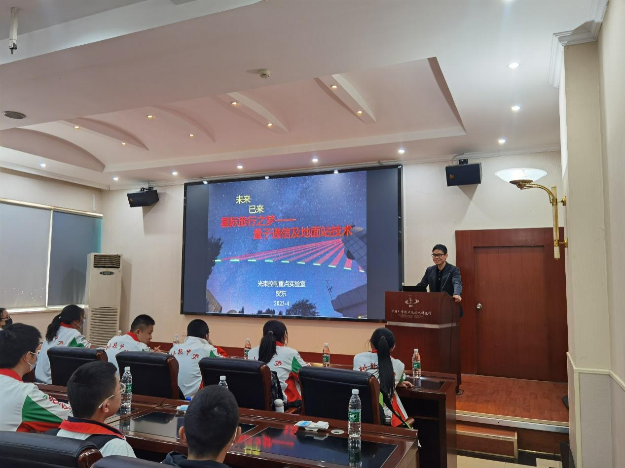 在开展关于量子通信技术讲座环节,由光束控制重点实验室的贺东老师为同学们揭秘量子通信及地面站技术,为同学们展望未来星际之旅。报告中贺东老师介绍了经典物理学到量子力学的发展,讲解了量子纠缠、光量子密钥分发等原理和重要意义,展示了量子通信现场照片和视频。