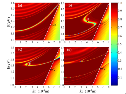 首先,研究人员将负折射率材料引入金属-反射膜结构中,发现负折射率材料调制金属-反射膜界面上的光学Tamm态色散关系,产生具有负的群速度的光学激子,这种具有负的群速度的光学激子在信息传输等领域有着重要的引用。研究人员进一步调整负折射率材料薄膜的厚度(图一),发现负的群速度光子激子产生条件和光的能量传播方向以及平均能量密度密切相关,只有当光的能量传播方向和体系的平均能量密度相反时,负的光束传播群速度才会出现。