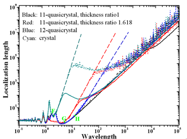研究人员进一步开展了负折射率膜层中折射率无序影响光学薄膜体系中光子的传输特征的研究,他们通过选择正负折射率材料使光子的传输在无序缺失的情况下完全透明,然后在体系中引入折射率无序,研究了光子晶体、光子准晶等不同结构中光子的定域特征。研究发现,在当多层薄膜体系中的折射率平均值为零时,在折射率无序体系中出现反常Anderson 定域,其定域长度的度规参数和薄膜的结构密切相关,如图二所示。该研究对改善光学薄膜体系中光束传播性能具有重要作用,在太阳能电池等领域有着潜在应用,研究成果发表在Optics Express专栏中。