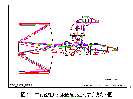 中国科学院光电技术研究所应用光学研究室在共孔径宽光谱红外双波段消热差光学系统研究上取得新进展:提出了一种共用光路部分为透镜和反射镜相结合,利用二色分光镜实现分光探测成像,通过巧妙搭配合适的光学材料、机械材料和分配光焦度,可实现两个支路系统在较宽温度内取得良好成像性能的共孔径红外双波段消热差光学系统结构形式。