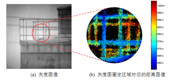 图中所示为1公里外塔楼顶部栏杆图像,(a)为白天普通相机拍摄的灰度图像,(b)为面阵三维成像激光雷达系统探测得到的距离像。由距离图中可以清晰地看到栏杆立体结构层次以及它们的距离间距信息。