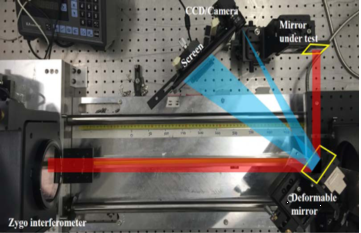 图2为检测实验现场图,图3为变形镜产生第四项和第九项zernike面形时,DS得到的变形条纹图和对变形镜面形变化的检测结果。实验中被测件为一带有像散的未知曲面,如图4(a),其面形误差超过了干涉仪的测量动态范围,因此干涉仪无法获得条纹而无法完成测量。基于该研究提出的测试装置及SPGD自适应搜索模型,在200秒左右就可获得待测自由曲面的清晰条纹,如图4(d)所示。这样根据检测硬件建立系统检测模型,结合干涉检测结果和条纹反射测量结果,通过面形匹配与系统误差标定技术,得到被测面的面形误差,检测结果如图5所示。