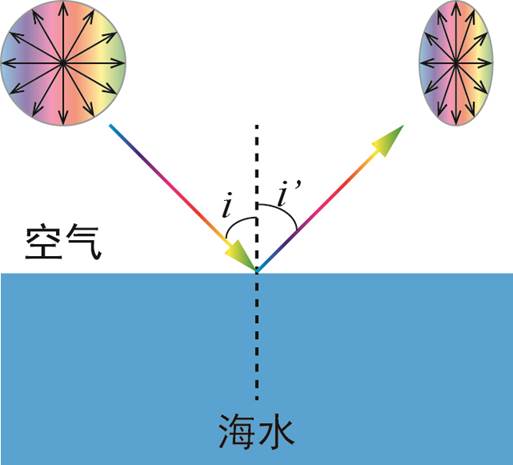 更有意思的是,由于海水存在一定的色散(折射率在不同波长有差异),即便是在占主导的偏振方向上,不同波长光的反射率也会存在一定差异,反射率最高的那个波长会成为“主波长”(Dominant Wavelength)。随着入射光角度i的变化,主波长也会发生偏移。上世纪六十年代,就有学者以地中海为例,研究了20℃情况下反射光主波长随着入射角变化曲线[注释2]。