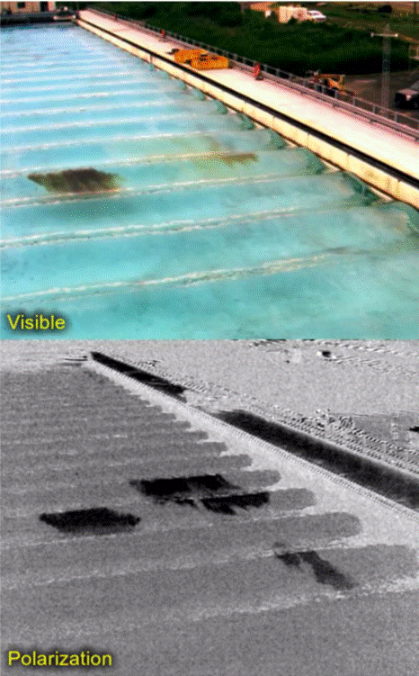 再举个例子来直观说明一下偏振成像的威力吧。生活中我们偶尔会听到石油泄漏的新闻,新闻的配图往往是大片大片黑乎乎的石油浮在水面上,这给我们造成了一种错觉,似乎石油浮在水面上是非常容易发现的事情。实际上,这是泄漏非常严重才会出现的情景,当石油管道或储油罐刚开始发生泄漏时,只会在水面上漂浮薄薄的一层油膜,仅凭借视觉观察是很难发现的。但由于油和水反射光的偏振特性相去甚远,因此有了偏振成像技术,哪怕只是薄薄的油层,也能够很快发现。下图就是一个演示实验[注释3],比较厚的油层(左侧)在普通观察下就很显眼,而右侧较薄的油层几乎看不到;但无论油层是厚是薄,在偏振相机中,都显示为明显的黑色。